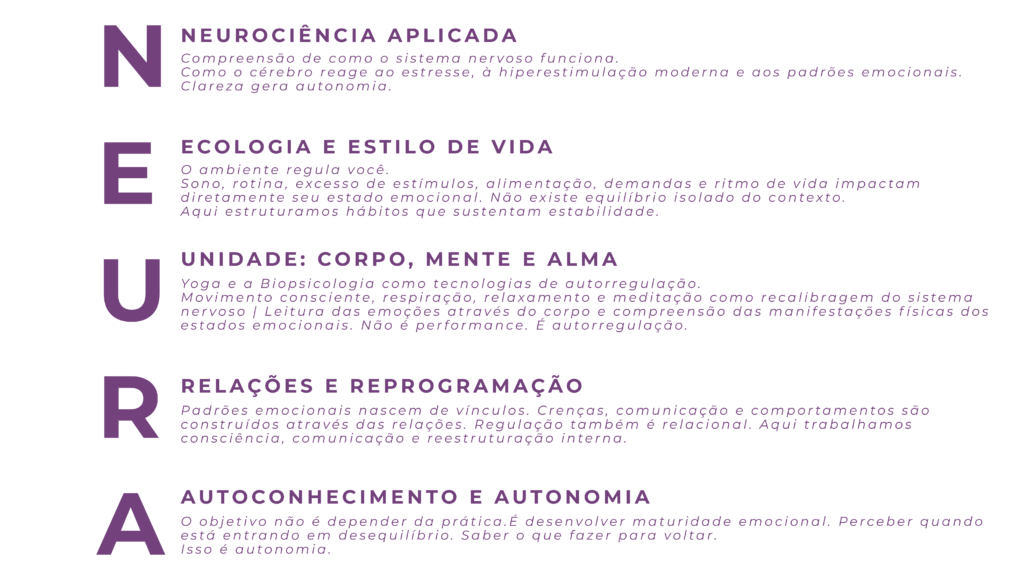 Aprenda a sair do estado constante de alerta e recupere sua estabilidade emocional com o Método NEURA, um sistema de regulação emocional baseado em ciência para a vida moderna.